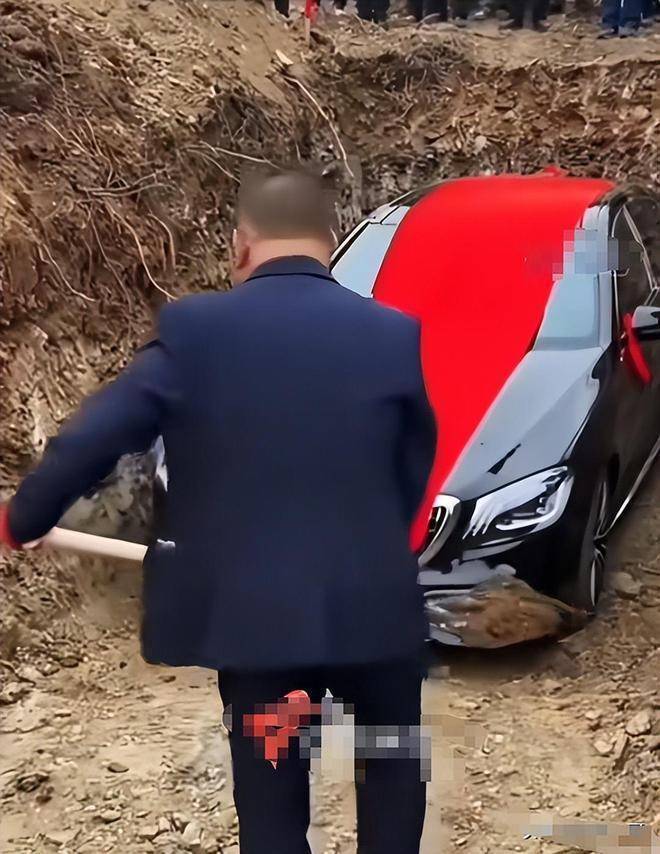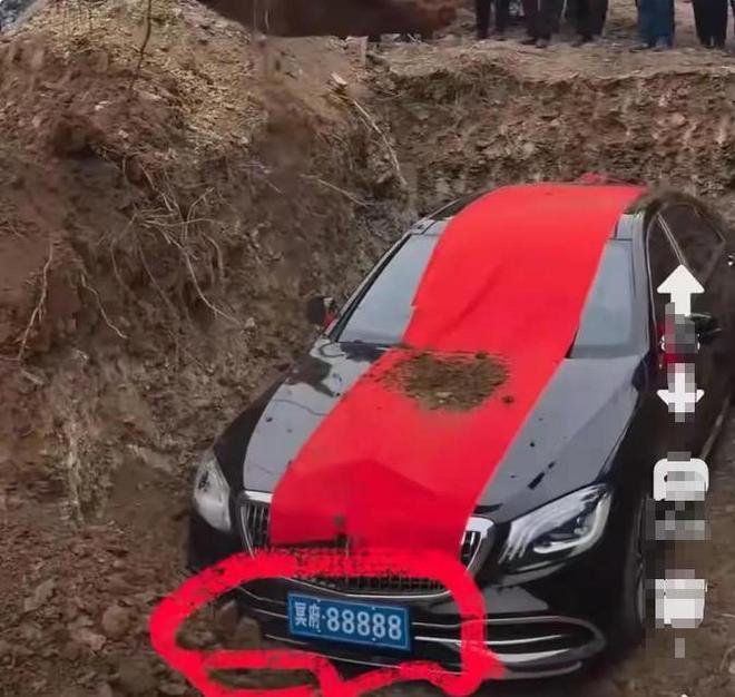随后一铲一铲填土,没过多久,这辆车就被埋在了地下,成为了所谓的“陪葬品”。