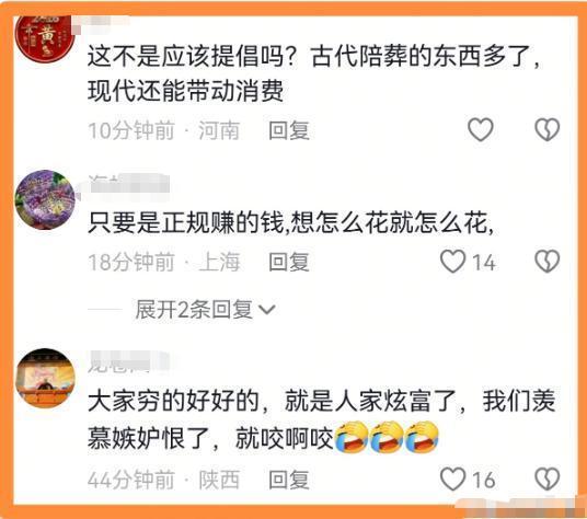 还有东说念主认为,这种不必要的奢靡攀比让通盘殡葬风尚变得十分恶劣,必须要阻绝这类气候的发生!